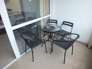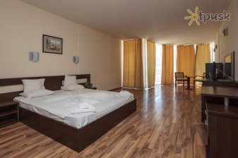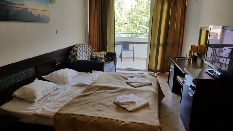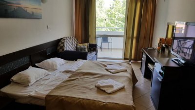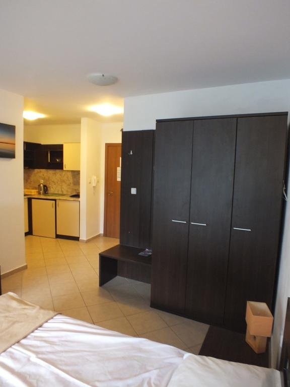 Apartamentul are 1 dormitor, TV cu canale prin satelit, 1 baie cu duș și bucătărie dotată, cu frigider și cuptor. Hotelul dispune și de o terasă și oaspeții se pot bucura de o pisicină cât exterioară, atât și interioară.